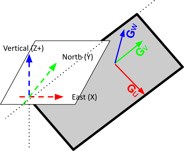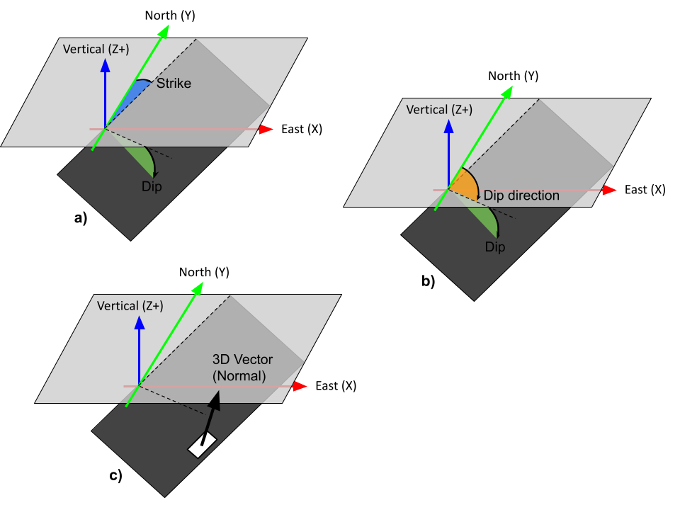The dip angles (degrees) are positive downward from the horizontal. The strike and dip direction angles (degrees) are positive clockwise from North. The 3D vector vector data defines the unit normals, which are perpendicular to both the Dip direction & Dip and Strike & Dip directions. As illustrated below, all three formats define a rotated plane in 3D.