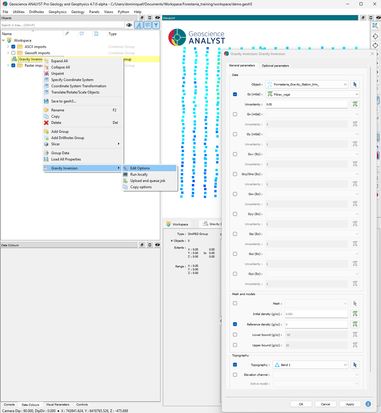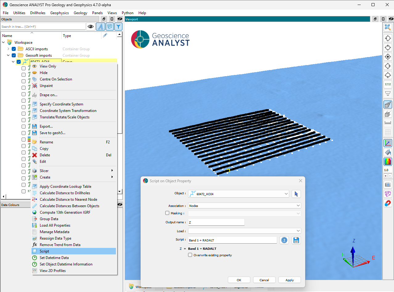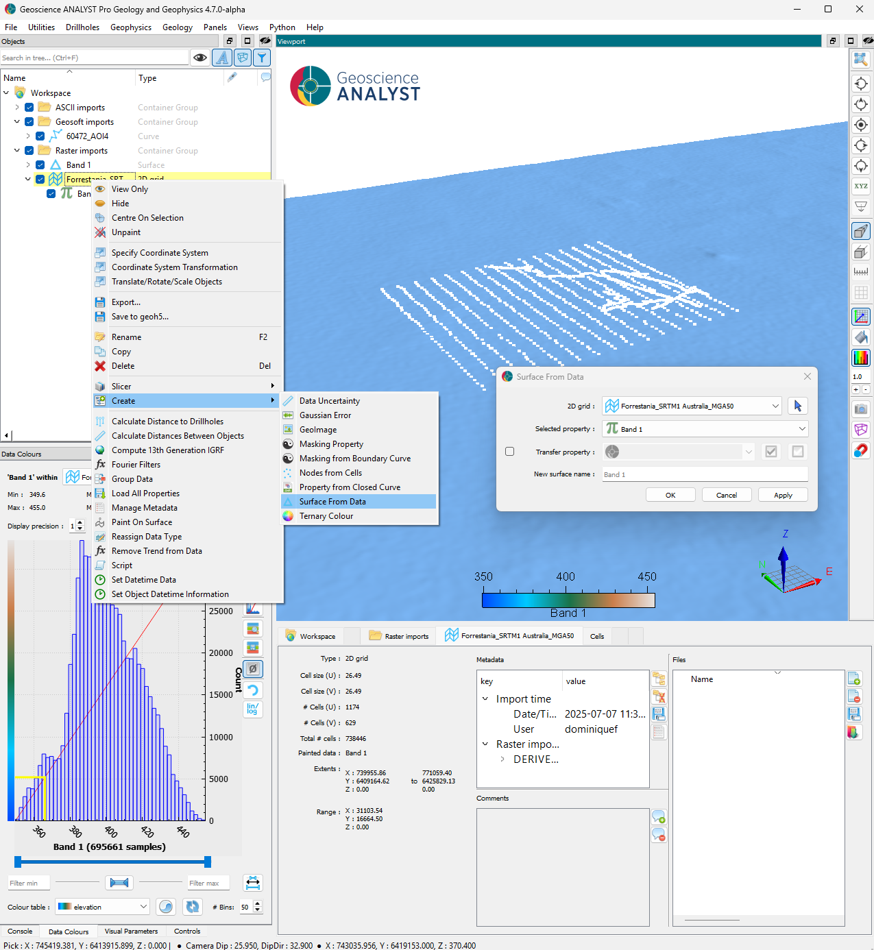 Note that both the DEM and airborne magnetic survey were imported at an arbitrary 0 m elevation and do not reflect the true position. We first need to modify our object such that the data is accurately located in 3D space.