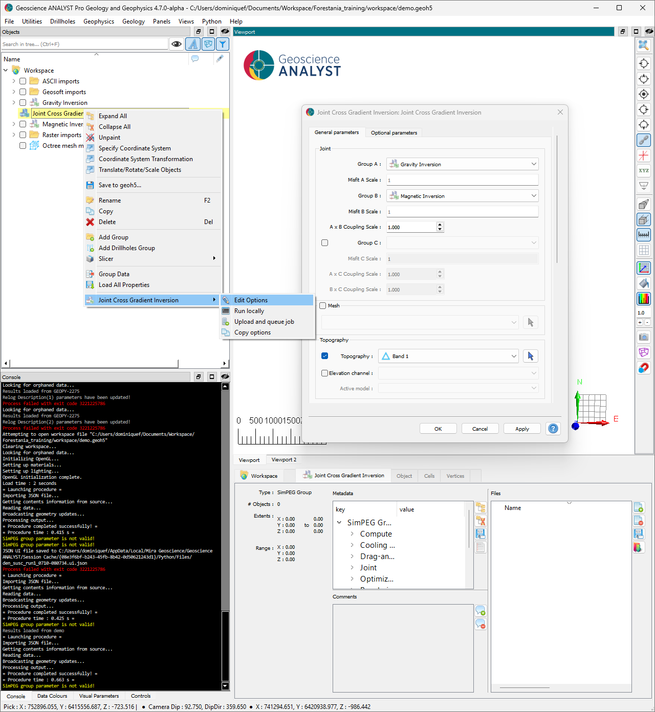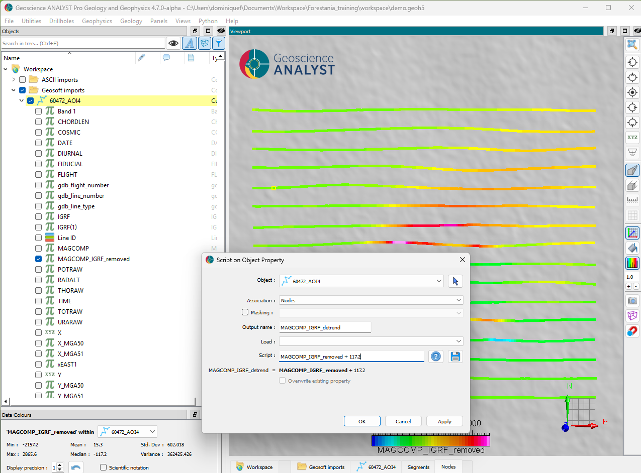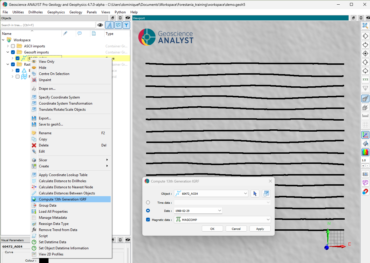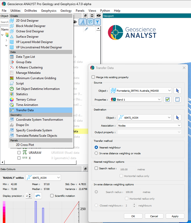 Note that both the DEM and airborne magnetic survey were imported at an arbitrary 0 m elevation and do not reflect the true position. We first need to modify our object such that the data is accurately located in 3D space.