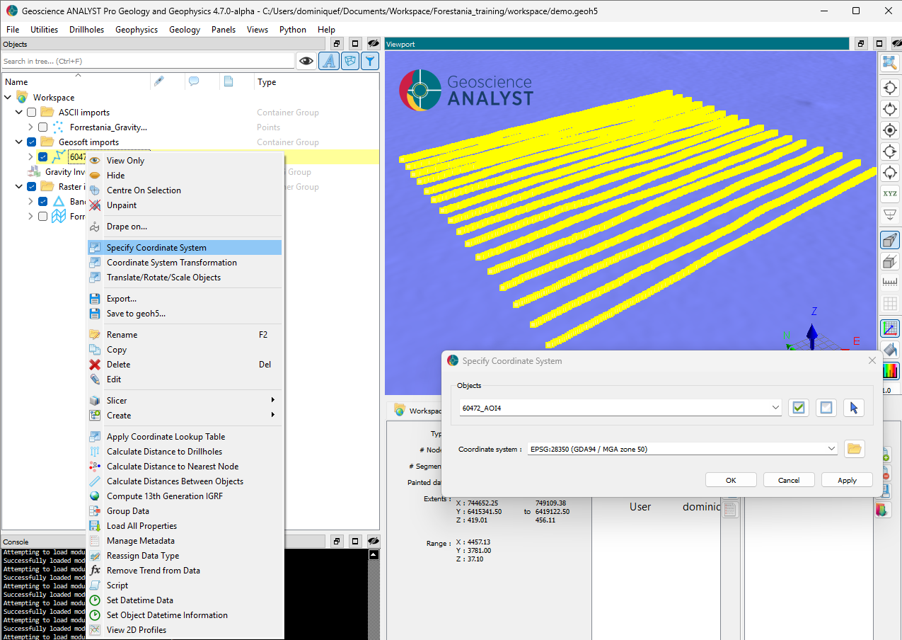 Before computing the IGRF, we need to locate the survey in world coordinates. This specific project is referenced to the MGA zone 50 coordinate system.