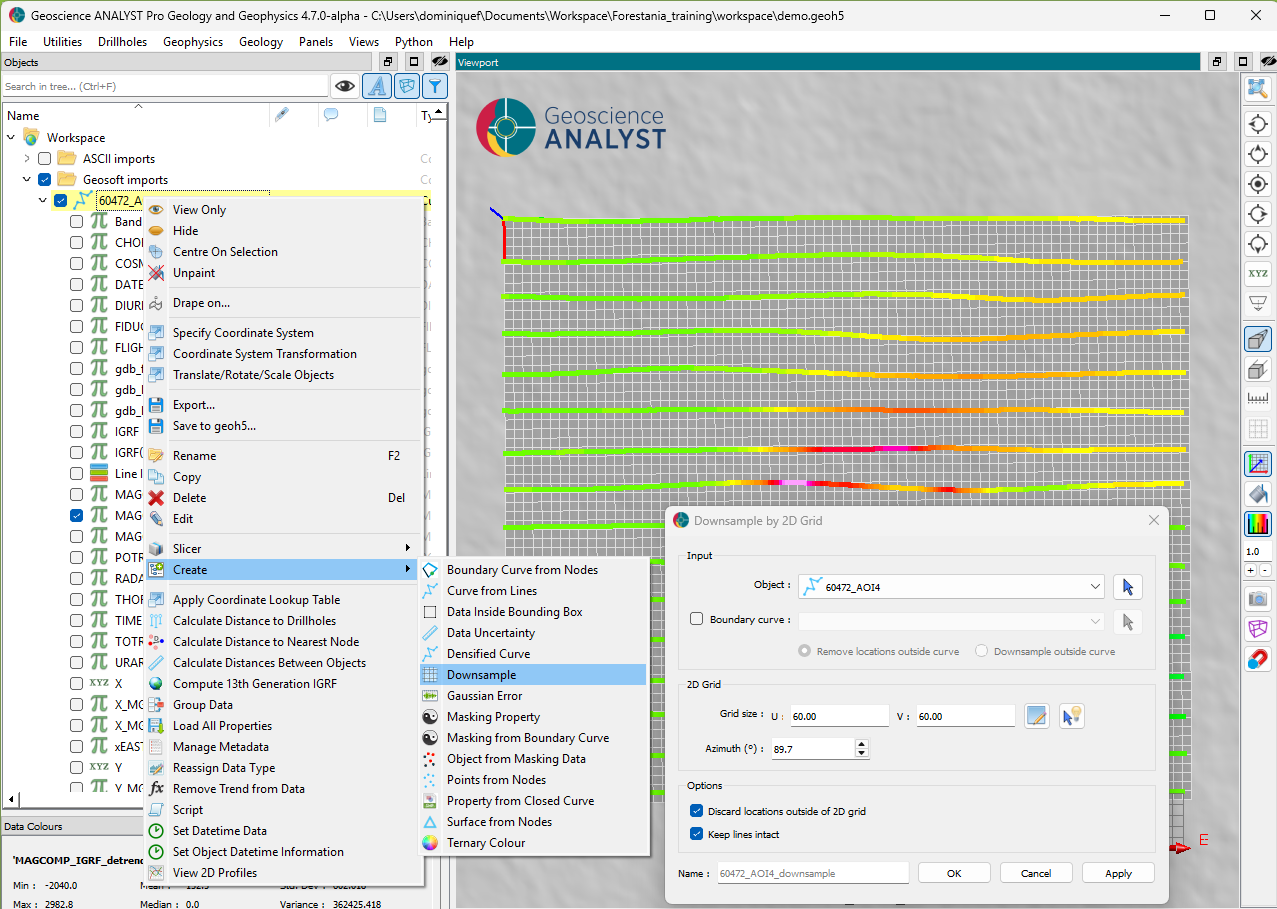 We can downsample the data along lines to reduce the computation cost of the inversion. Since the average flight height of this survey was 60 m, we can confidently downsample the lines by the same amount without affecting the wavelengths contained in the data.