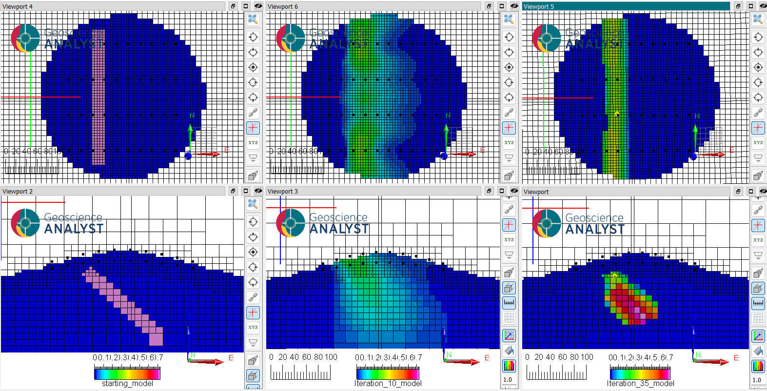 Fig. 1 (Top) Horizontal and (bottom) vertical sections through (left) a simple dipping dyke model under smooth topography. (Center) Model recovered using the conventional smooth norm inversion. (Right) Compact model obtained with a dip rotation of \(45\circ\) towards East.#